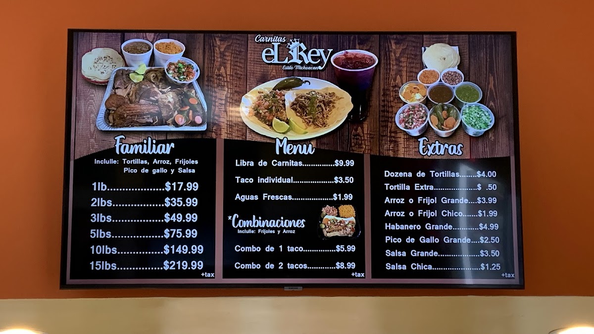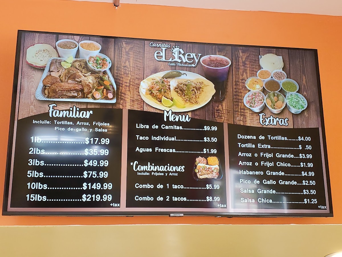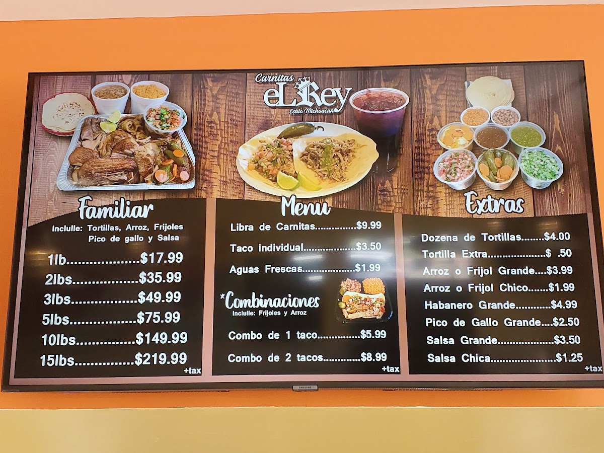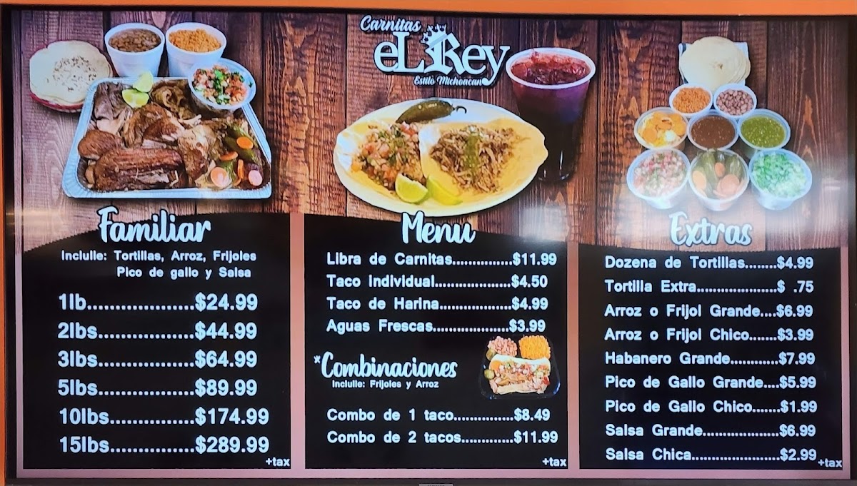 Carnitas El Rey in Santa Paula offers a menu that balances classic Mexican staples with hearty family-style options, making it appealing for both quick bites and weekend feasts. The Taco Individual is a simple yet satisfying choice, while the weekend-exclusive 2 Birria Tacos Combo and 1 Taco De Birria Combo showcase rich, slow-cooked flavors that fans of birria will appreciate. For those looking to share, the 1 Lb Birria De Res Family and 1 Libra De Chicharron bring generous portions to the table, alongside the massive 5 Lbs Family option. Complementing these mains are thoughtful extras like 6oz Guacamole, Salsa Verde Mediana 6oz, Arroz Chico 12oz, Frijol Grande 32oz, and Frijol Chico 12oz, which allow diners to customize their plates. Drinks range from Gatorade and Cans Sodas/ Sodas De Lata to Monster, Glass Sodas, and refreshing Aguas Frescas, catering to all tastes. The menu also includes items like 1/2 Lb De Birria De Res and 2 Lbs De Birria De Res available only on weekends, as well as 32oz Menudo Con Grano, perfect for a hearty brunch or celebratory meal. Even non-food items like Carnitas El Rey T-Shirts in sizes S through 2XL add a touch of local charm to the experience. Overall, the menu at Carnitas El Rey balances indulgence and variety, giving visitors an opportunity to enjoy both traditional favorites and generous family-style portions.